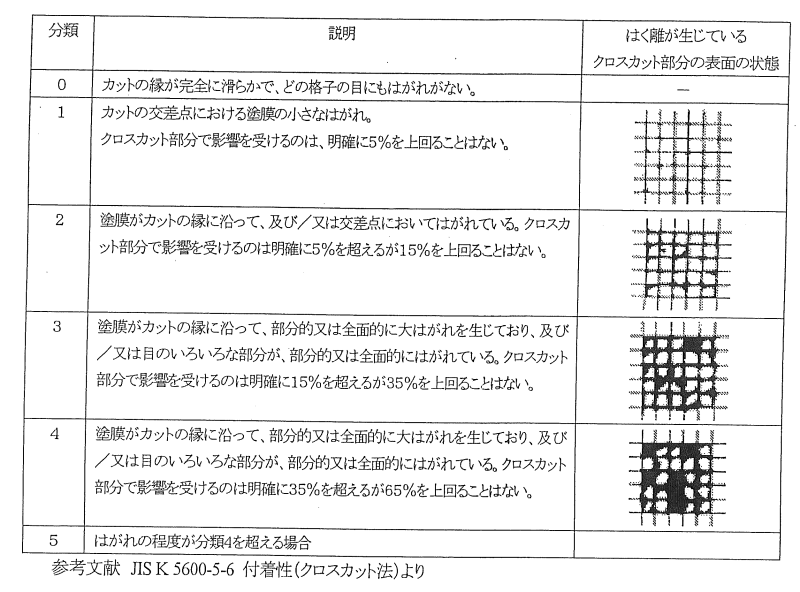 JISに「この方法を付着性の測定手段とみなしてはならない」と記述されているように、あくまで付着性の良否を判定する定性的試験方法になります。