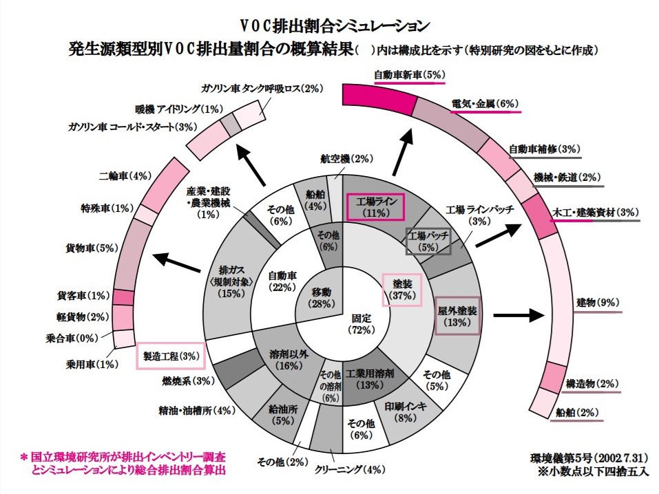 国立環境研究所が排出インベントリー調査とシミュレーションにより算出した大気へのVOC排出源類型の内訳によると、塗装によるものが全体の37%と最も多く、工業ライン塗装によるものだけでも全体の11%となっています。(図1参照)