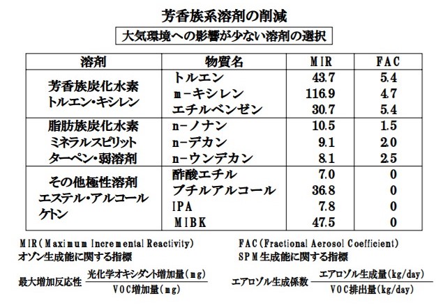 第10回化学物質と環境円卓会議における環境省の資料によれば、2000年に固定発生源から排出したVOCの総量の推計値は150万トンで、そのうち56%が塗装によるものとされています。また、代表的なVOCの種類と量をみると、トルエンと混合キシレンが最も多く約45万トン程度で全体の1/3程度程度を占めます。日本塗料工業会がまとめた2001年度のVOC大気排出の割合でもトルエン混合キシレンが多く、全体量45万に対し約50%を占めるとの報告があります。各塗料メーカーでは、特に大気中でVOCに変換しやすいと思われるこれらの溶剤を削減活動に取り入れる取り組みをすでにはじめています。建築塗料分野をはじめとする屋外塗装では、水性化を主体に進めていますが、水性化が難しい用途に対しては、非芳香族系のミネラルスピリット(ホワイトスピリット)などの通称弱溶剤と呼ばれる溶剤型塗料への置き換えを推奨してきています。溶剤の種類による大気環境への影響の違いに関するデータを図2に示します。MIR値が高いほどVOCが光化学オキシダントを生成しやすく、FAC値が高いほどVOCが2次粒子を生成しやすいと考えられています。キシレンやトルエンなどの芳香族炭化水素はいずれの指標も高い値となっています。一方、自動車をはじめとする工業用塗料においては、高意匠性を兼ね備えた水性中上塗り塗料の展開をはじめています。なお、混合キシレンとしているものは、3種のジメチルベンゼン異性体とエチルベンゼンの合計を表しています。